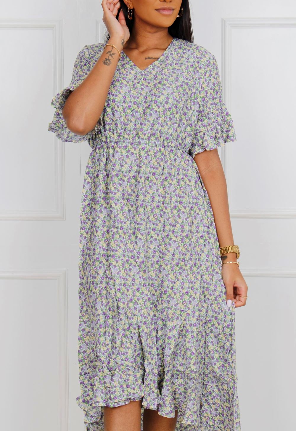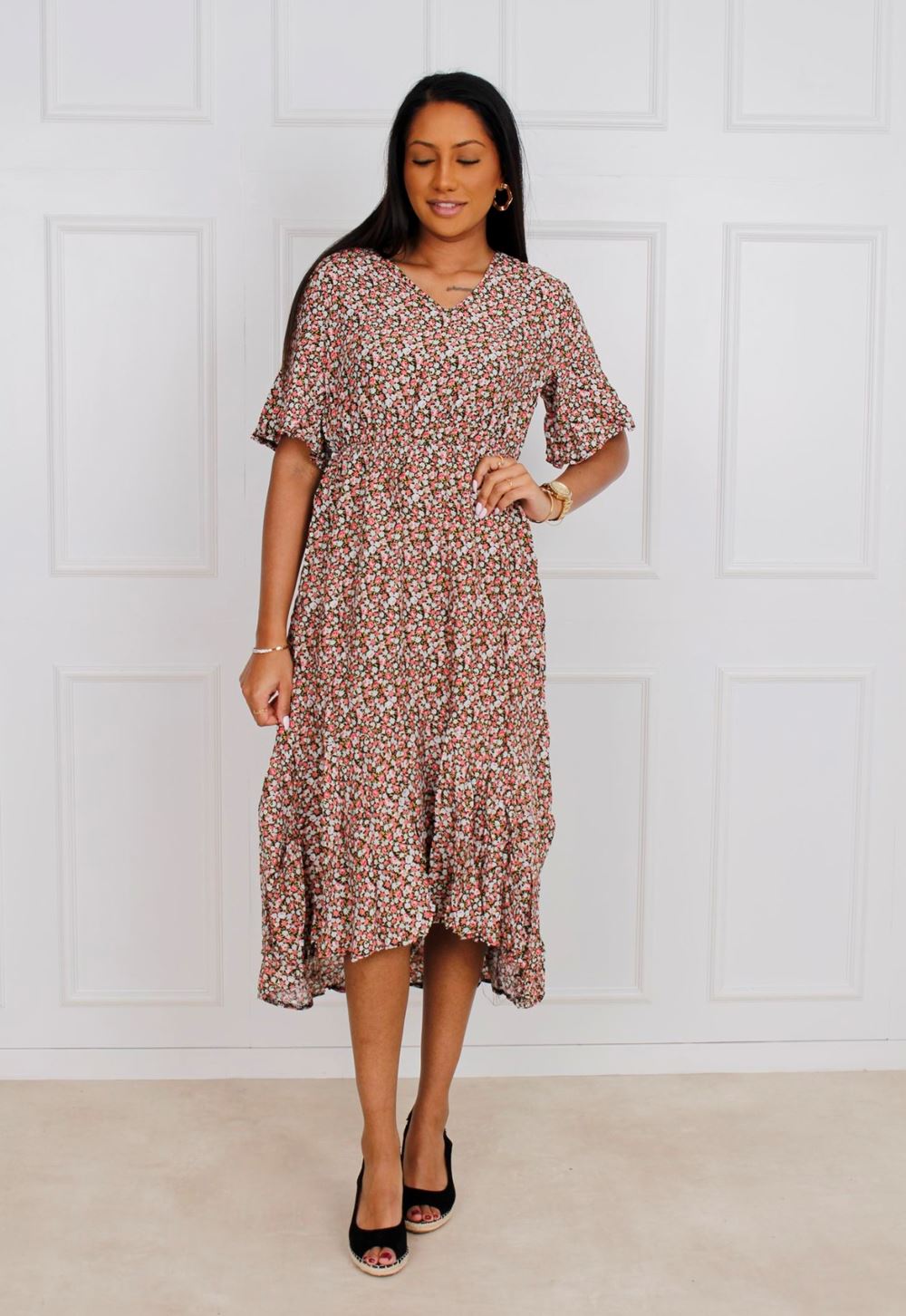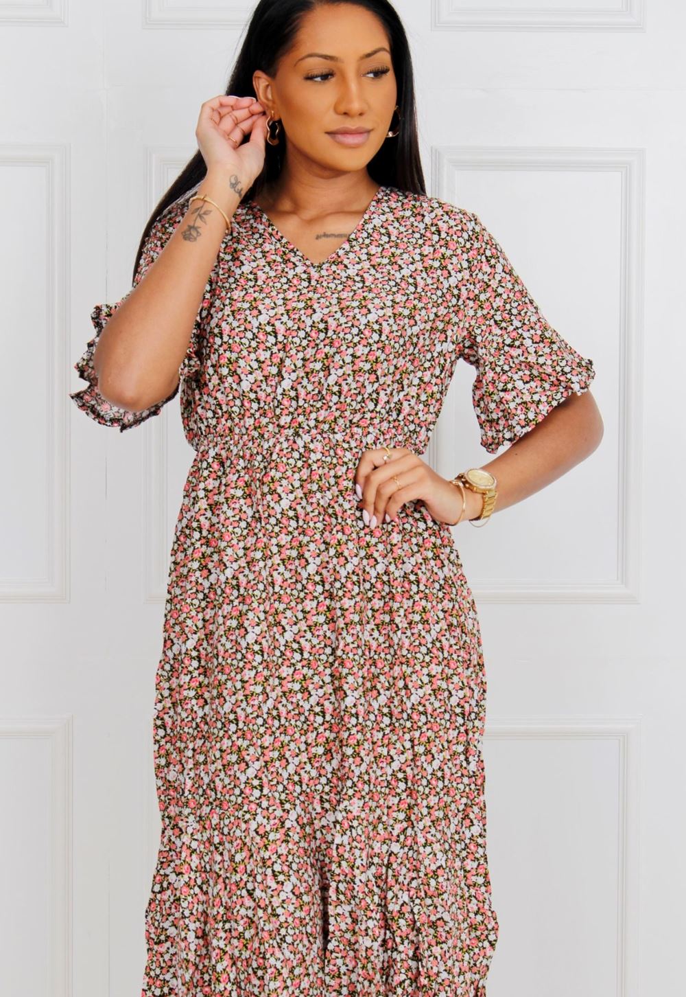 Let og elegant forårs/sommerkjole med V-udskæring og småt blomsterprint samt elastik i livet. Kjolen har et lille trompet ærme, samt en flæsekant forneden, som gør den elegant og feminin, også med et par sneakers. Få den i 4 forskellige farveviarianter.