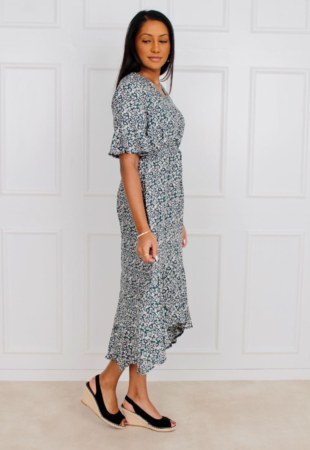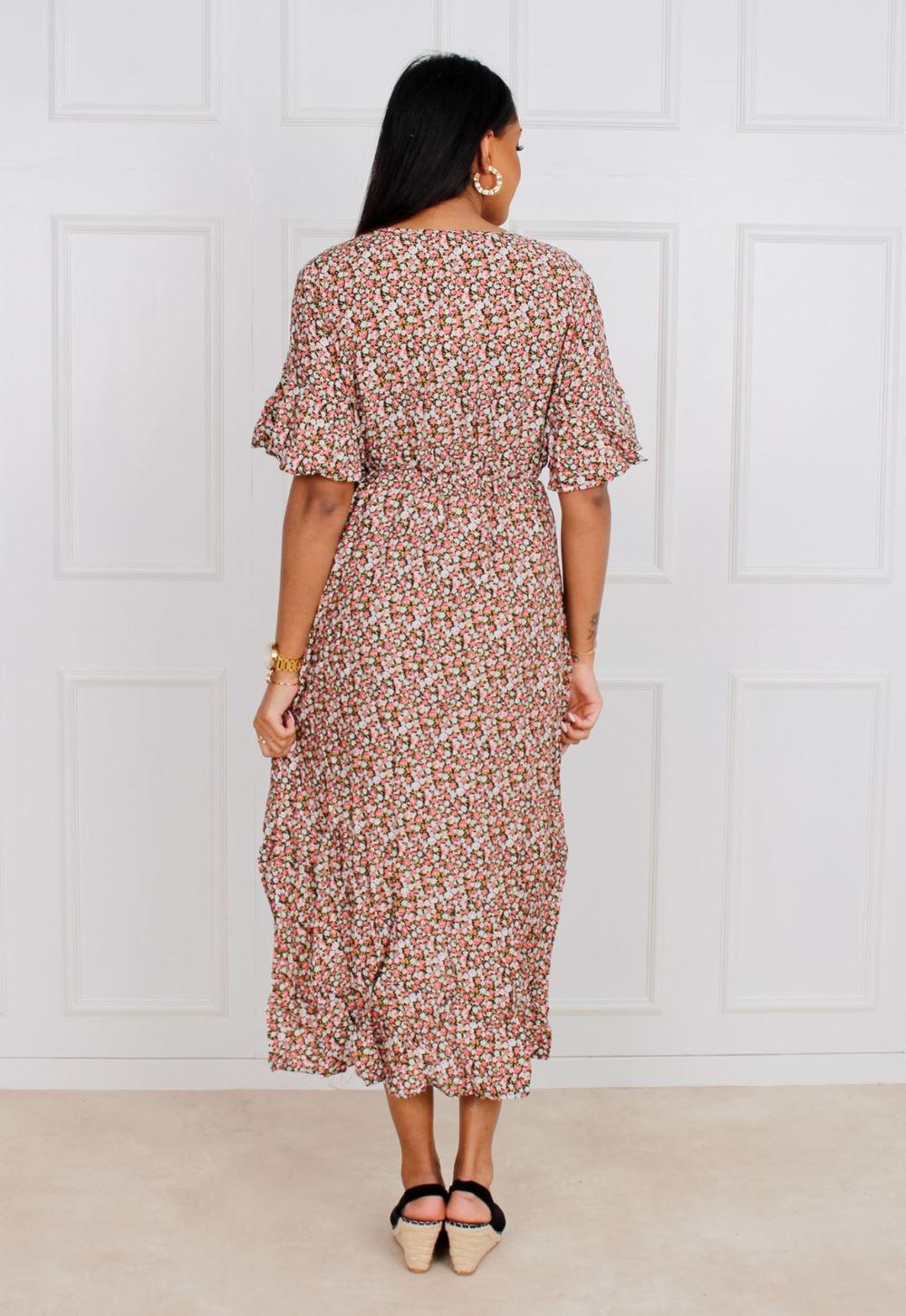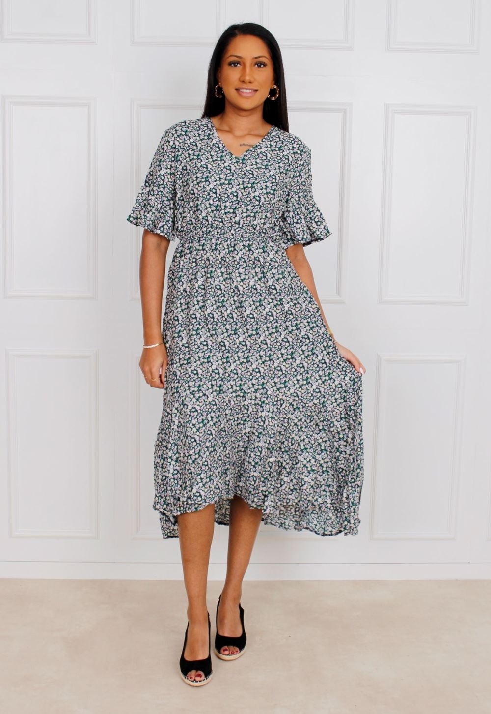 Let og elegant forårs/sommerkjole med V-udskæring og småt blomsterprint samt elastik i livet. Kjolen har et lille trompet ærme, samt en flæsekant forneden, som gør den elegant og feminin, også med et par sneakers. Få den i 4 forskellige farveviarianter.