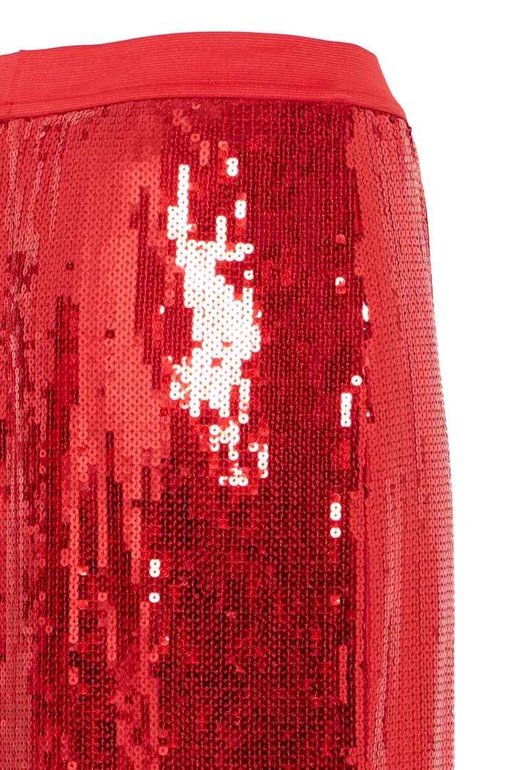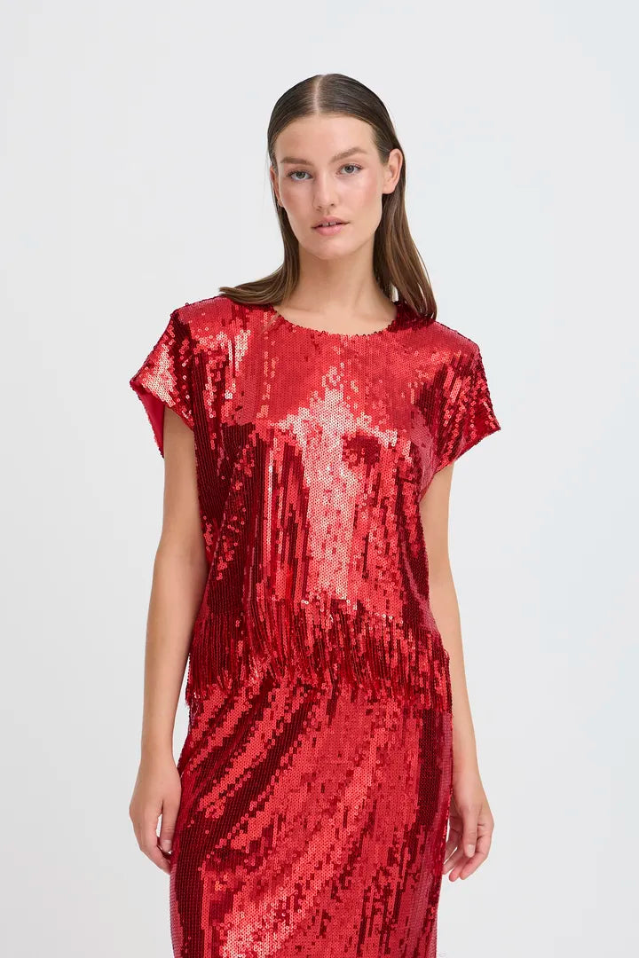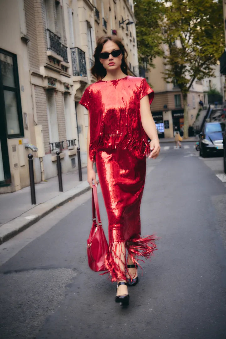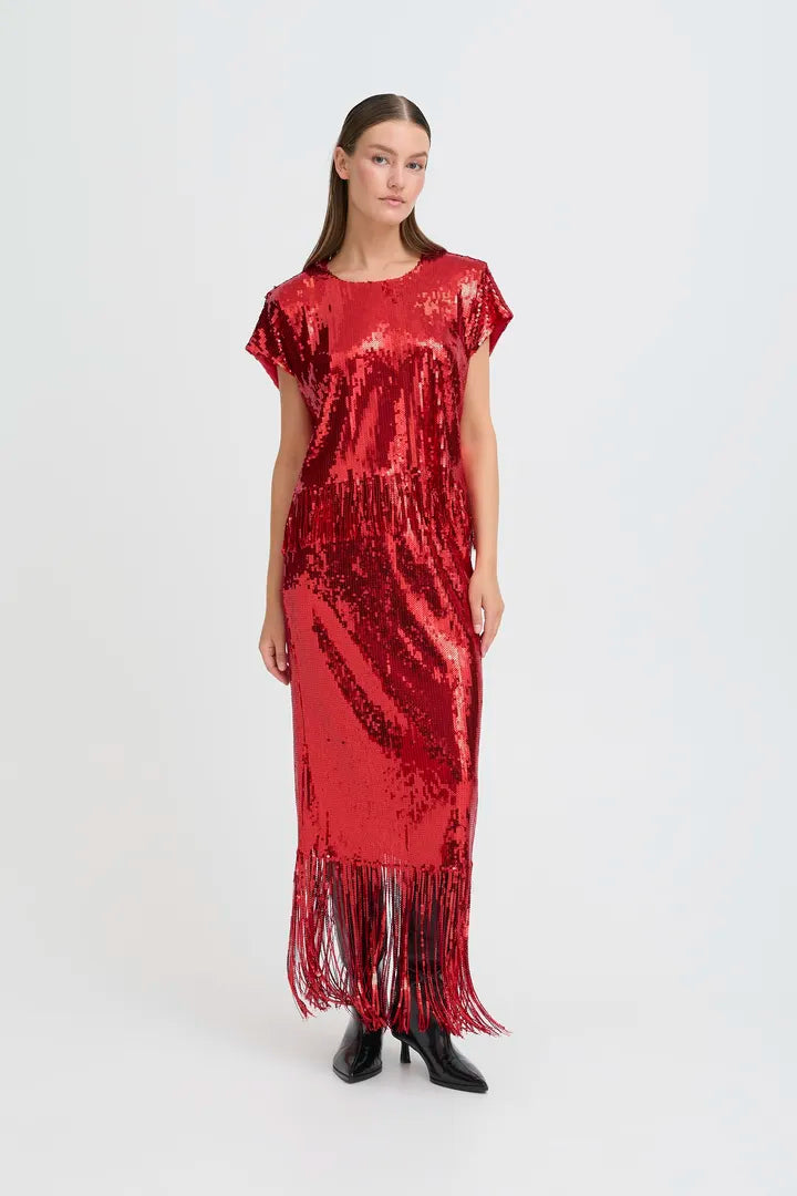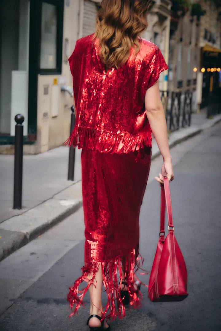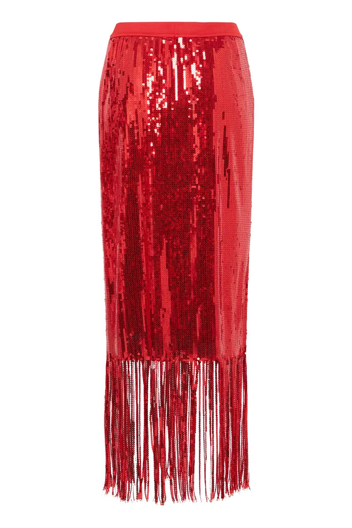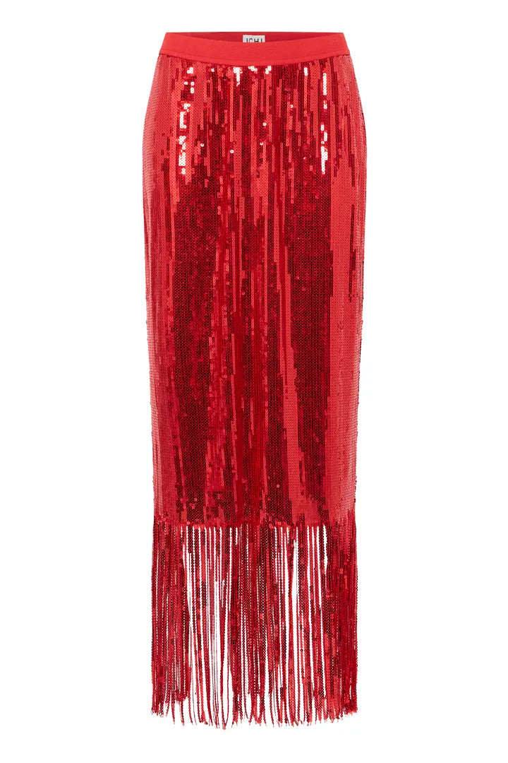 Pailletnederdel med markant glanseffekt, lige, ankellang pasform og bred linning. Lang frynsedetalje nederst giver et iøjnefaldende, levende udtryk