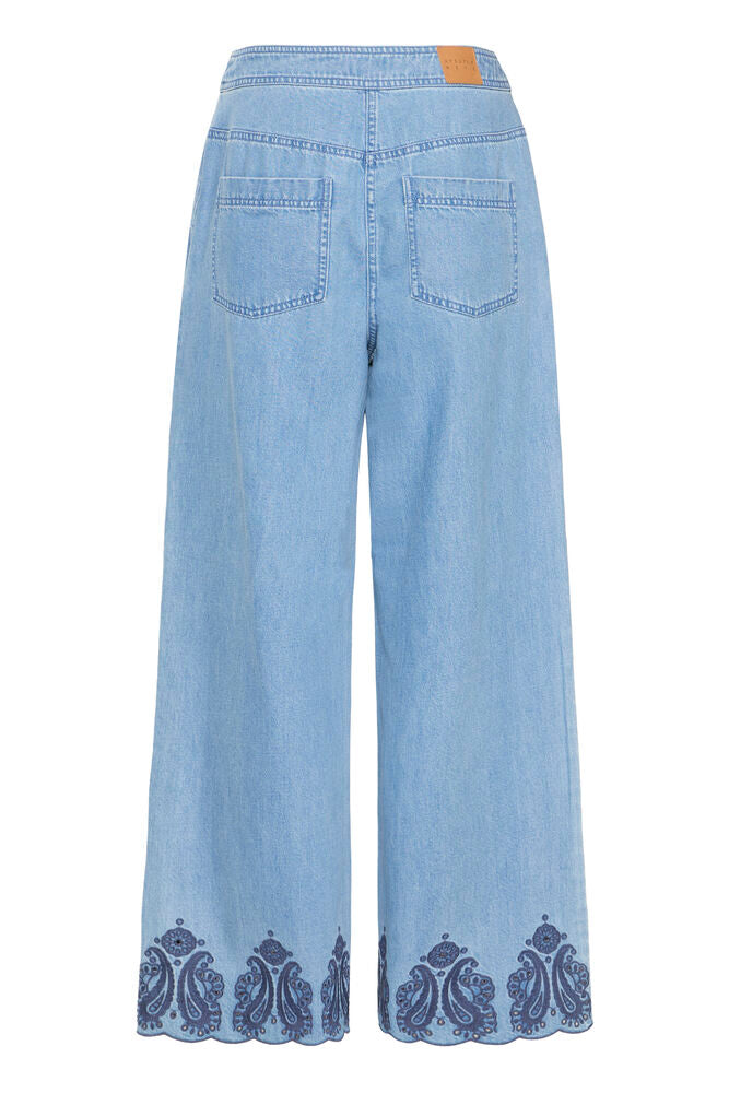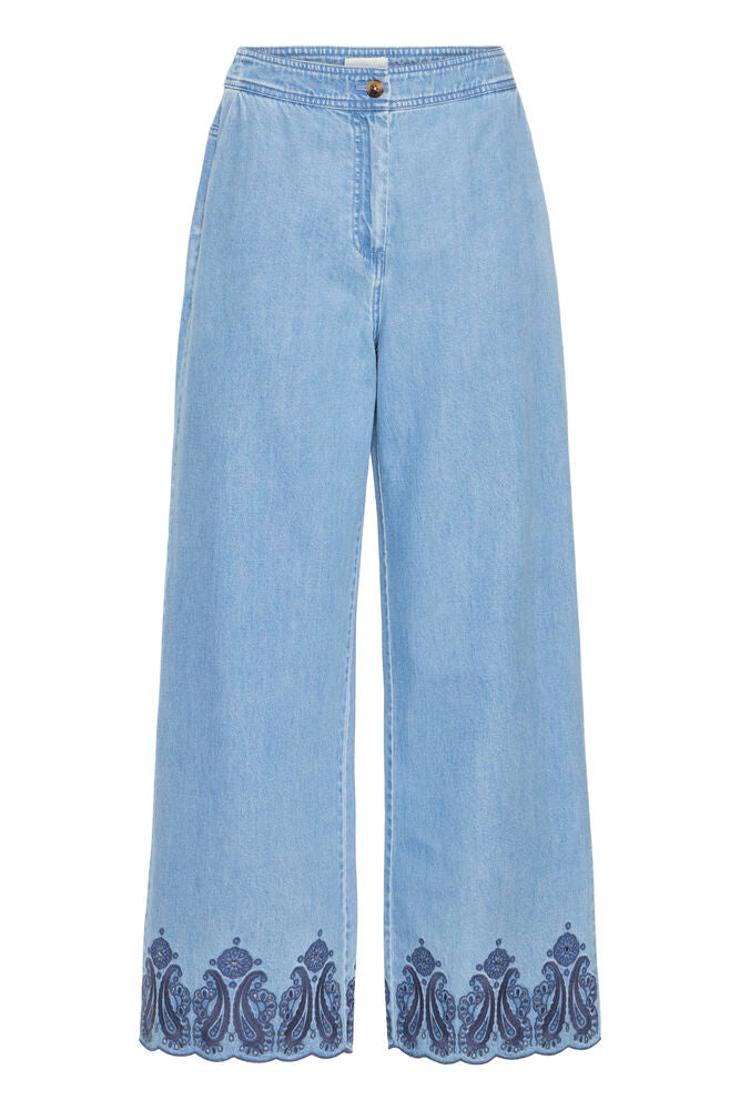 Ein lekkur og feminin denim‑buksa við víðum beinum og vøkrum detaljum. Hon hevur eitt avslappað loose fit við vanligari talju og ankellongd, sum gevur eitt lætt og summarligt uttrykk. Tilfarið er ein mjúk og behagilig blanda av bummulli og lyocell, ið gevur buksunum gott fall og komfort. Snið og detaljur gera hana perfekt til bæði gerandisdagar og fínari løtur.