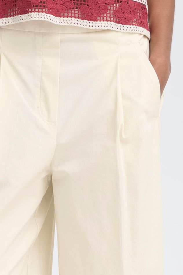 Disse bukser kombinerer brede ben med en afslappet silhuet og en blød, behagelig finish. Den høje talje og elastiske linning sikrer komfort hele dagen, mens de pressede forfolder og diskrete sidelommer tilfører et stilrent, moderne udtryk. Den cropped længde ved anklen giver bukserne et let og tidssvarende look.