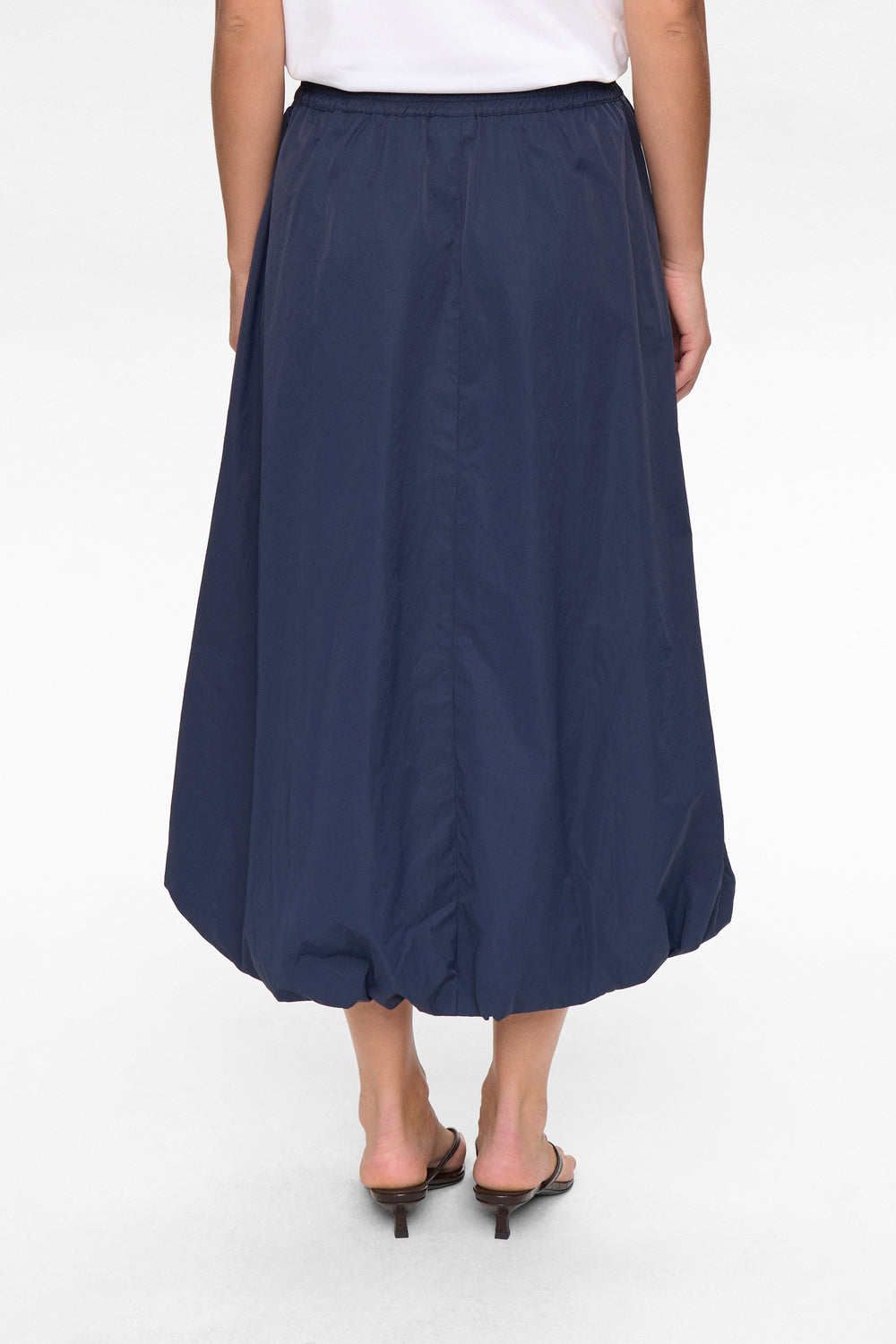 Nederdelen er formet som en klassisk “balloon skirt” — det vil sige med en voluminøs, lidt puffet silhuet, der giver et feminint og legende look. Den har et elastisk bånd i taljen og lommer i begge sider