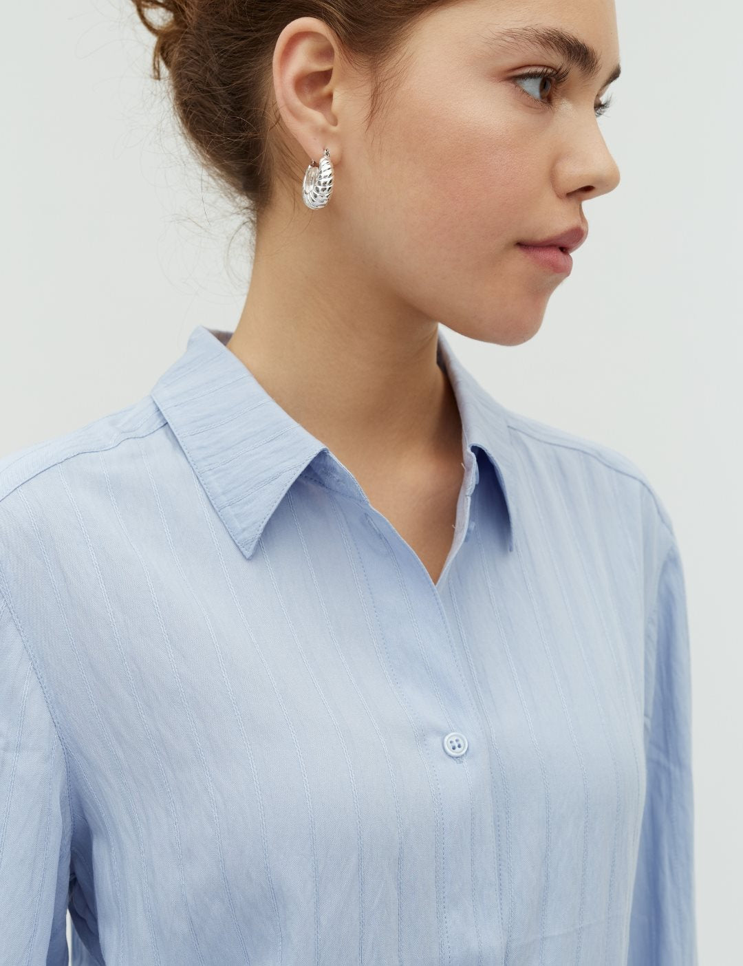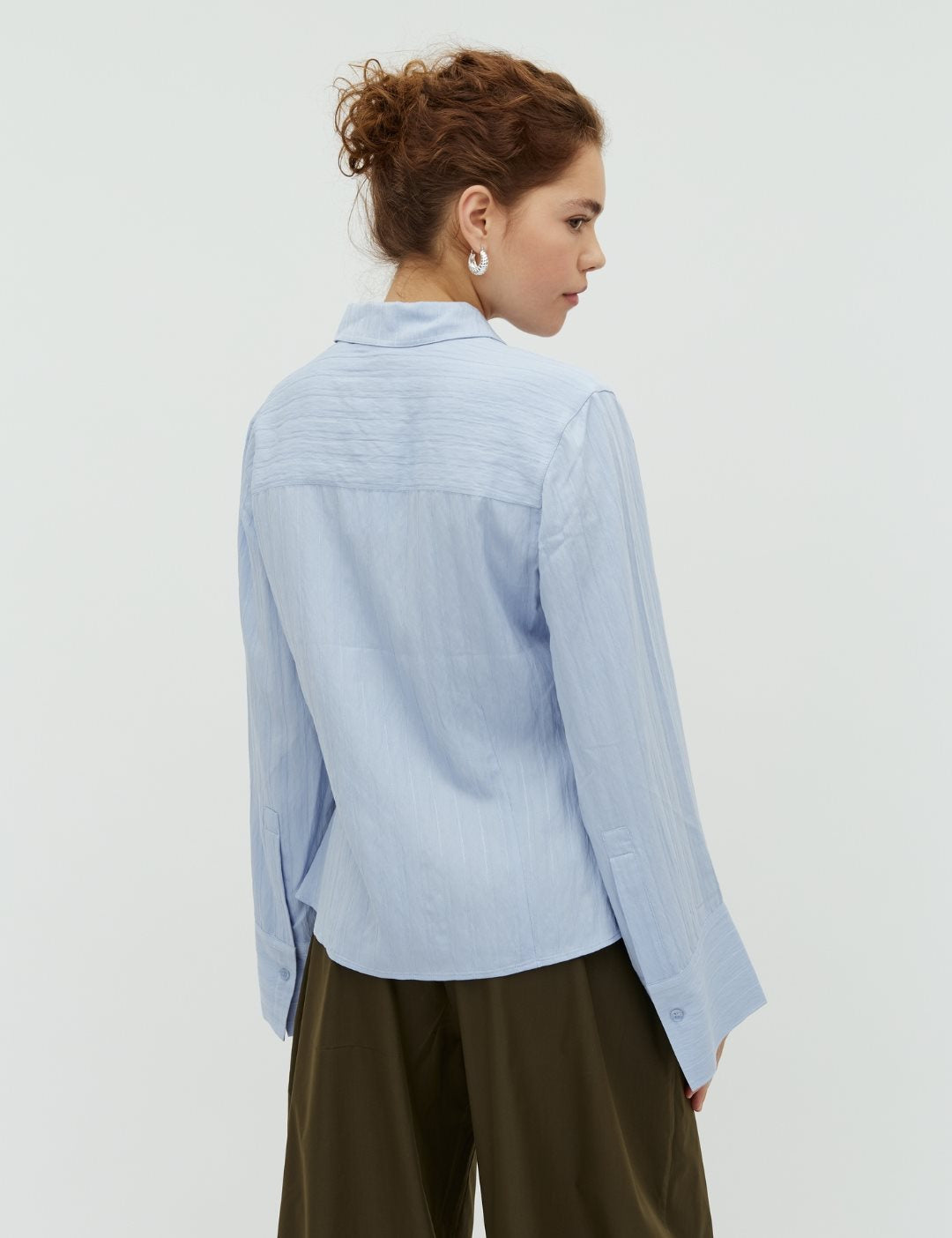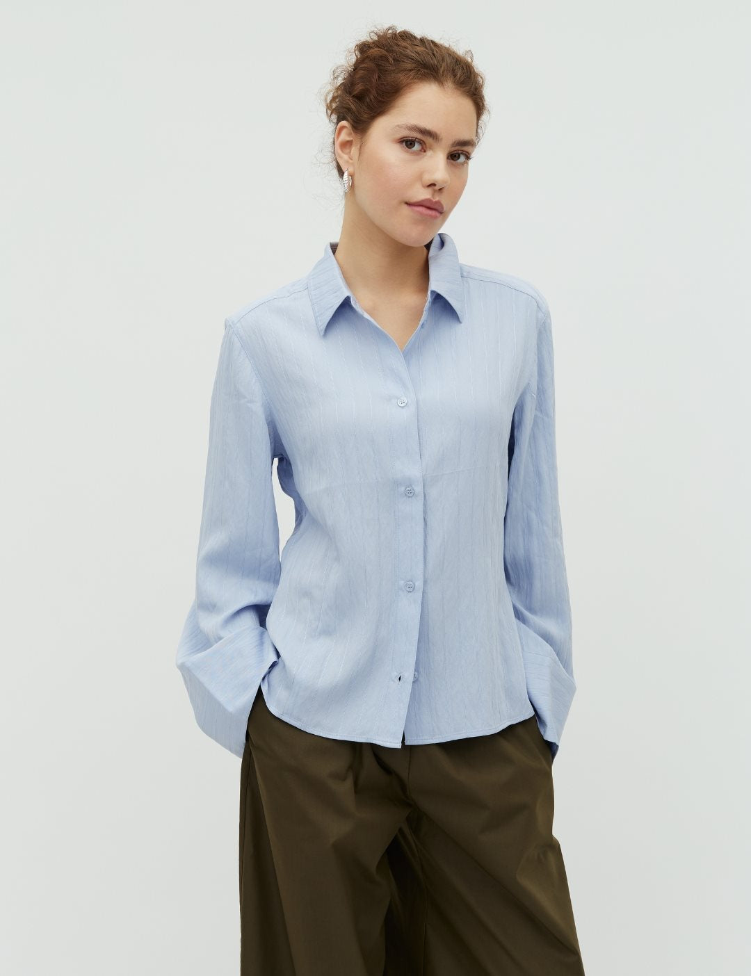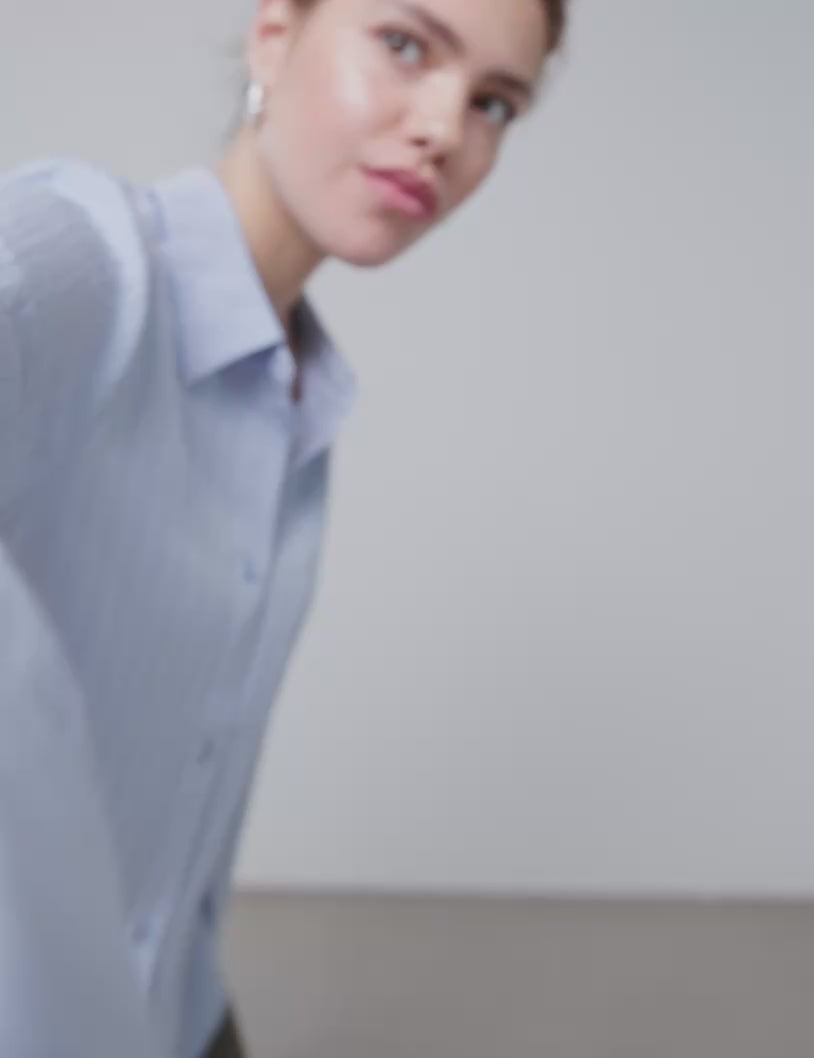 Elegant og moderne skjorte med brede, lange ærmer og markante manchetter, der giver et sofistikeret og let dramatisk udtryk. Den klassiske skjortekrave og knaplukningen gør den tidløs, mens den boxy pasform og den indsnævrede talje skaber en flatterende silhuet. En stilren style, der fungerer perfekt både til hverdag og pænere anledninger.