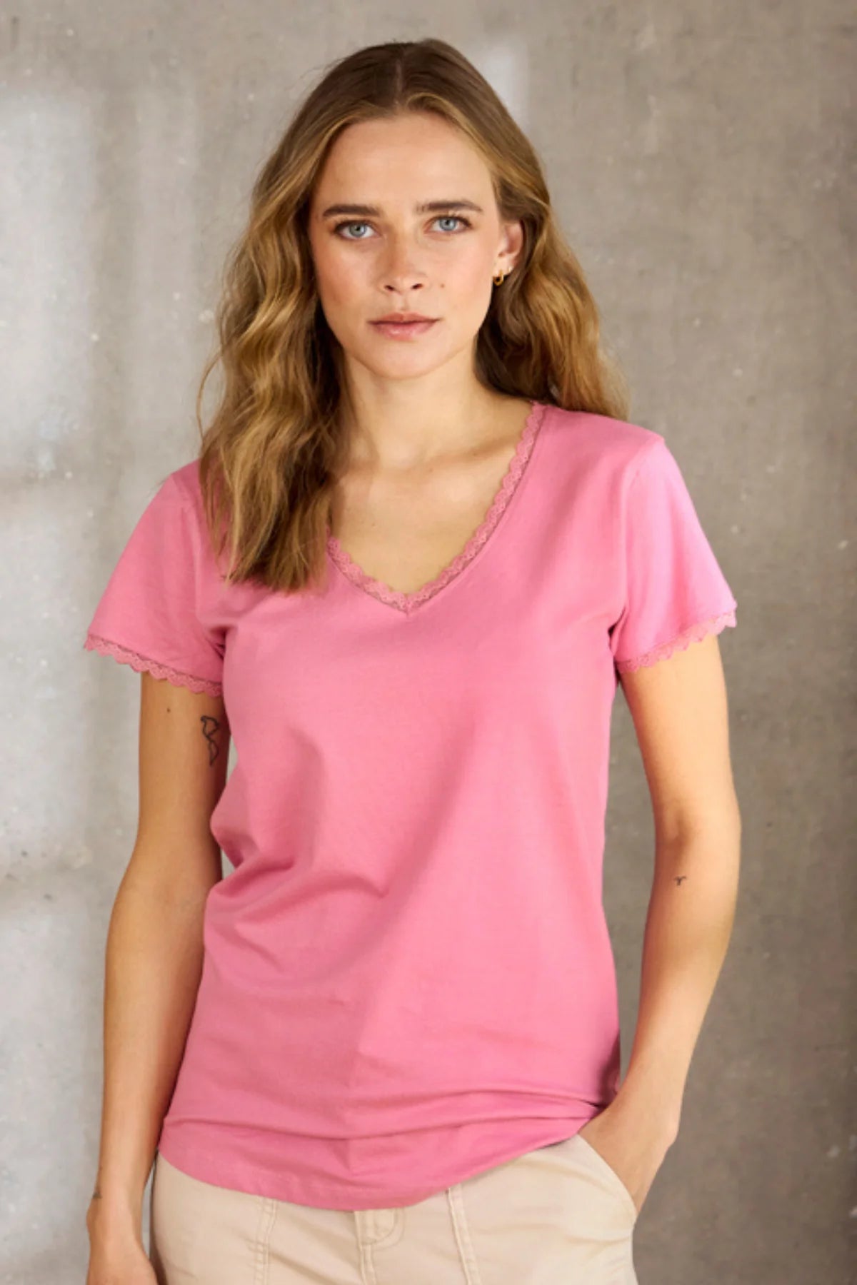 Daria 037 er en enkel og feminin T-shirt med klassisk pasform og V-udskæring. De fine blondekanter ved hals og ærmer giver et elegant touch, som løfter selv et afslappet hverdagslook. En alsidig basisfavorit, der er nem at style til både jeans og nederdele.