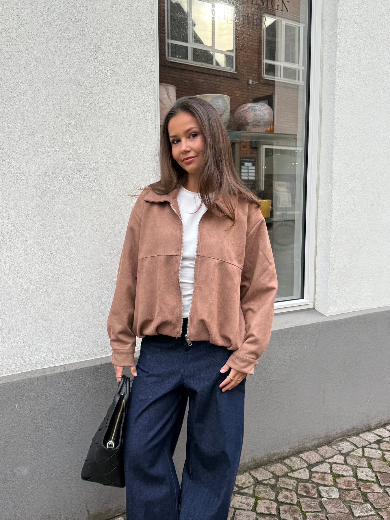 En stilren og blød jakke med et moderne suede look. Jakken har en afslappet, boxy pasform med sølvfarvet lynlås foran, klassisk krave og diskrete sidelommer. Den let strukturerede overflade giver et eksklusivt udtryk, mens den dybe cognac brune farve gør den nem at kombinere med både lyse og mørke nuancer.