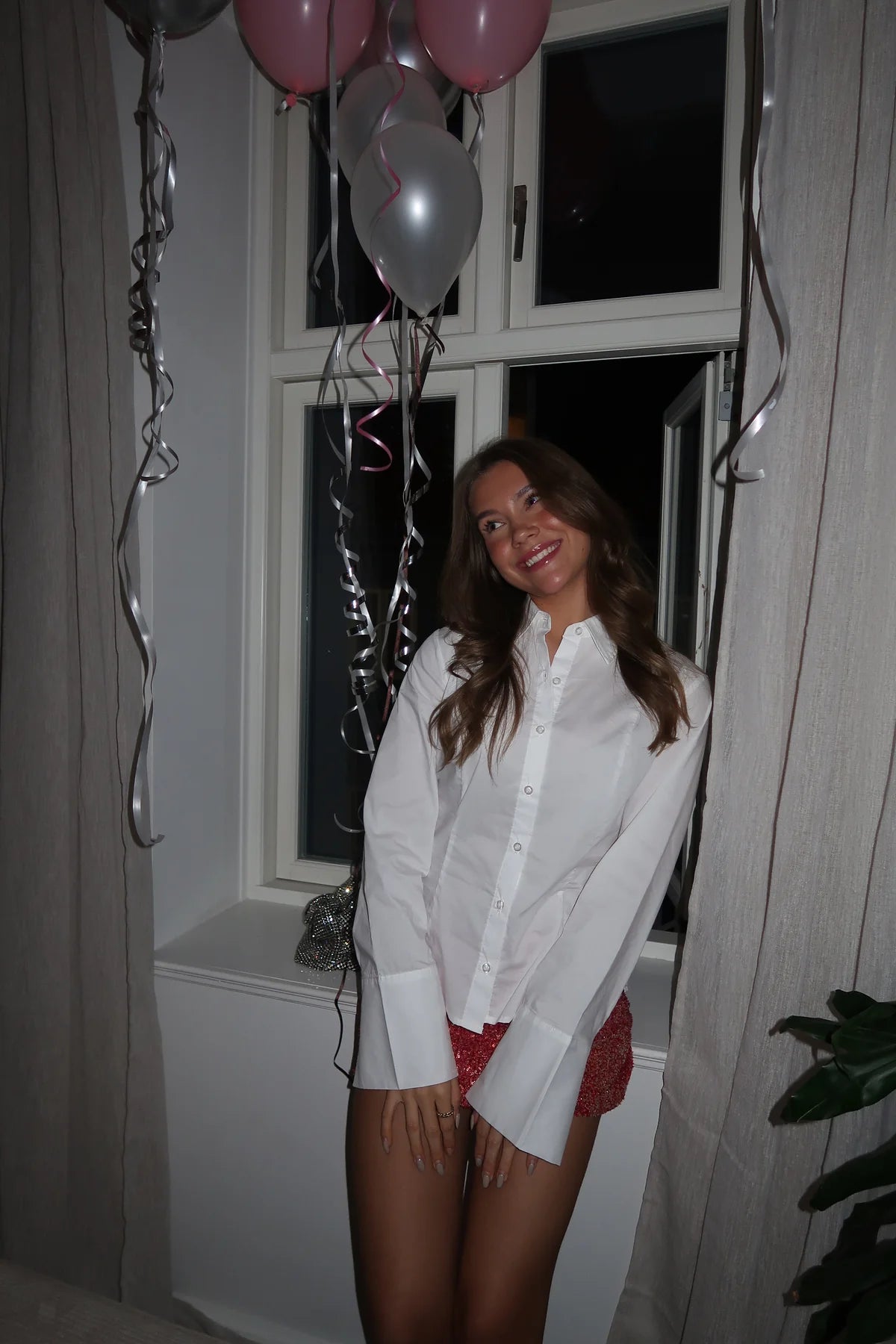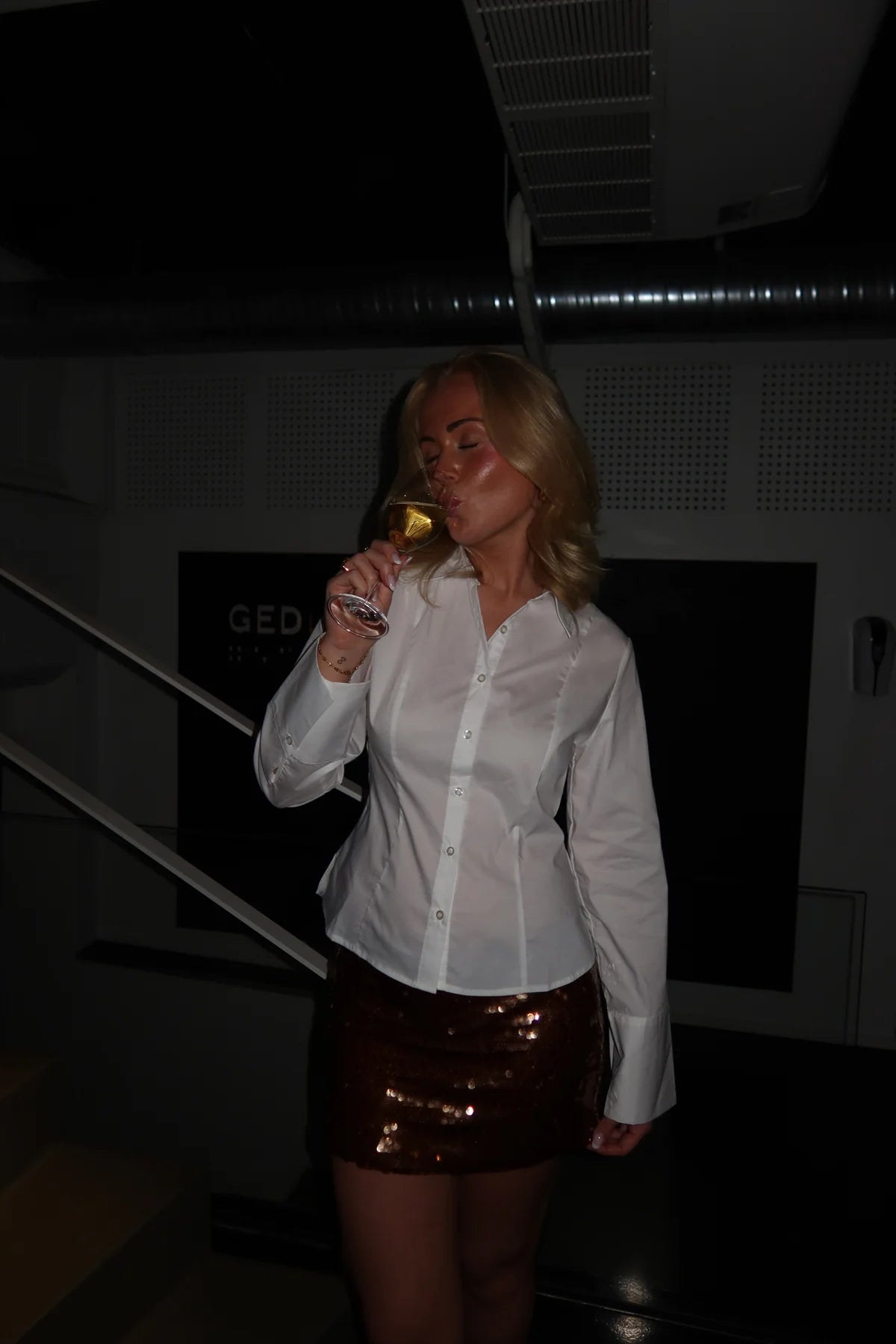 En tidløs hvid skjorte med et moderne, feminint twist. Skjorten er designet i et glat og let materiale, der føles behageligt mod huden og giver et elegant fald. Den figursyede pasform fremhæver taljen, mens de brede manchetter og klassiske knapper tilfører et sofistikeret udtryk.