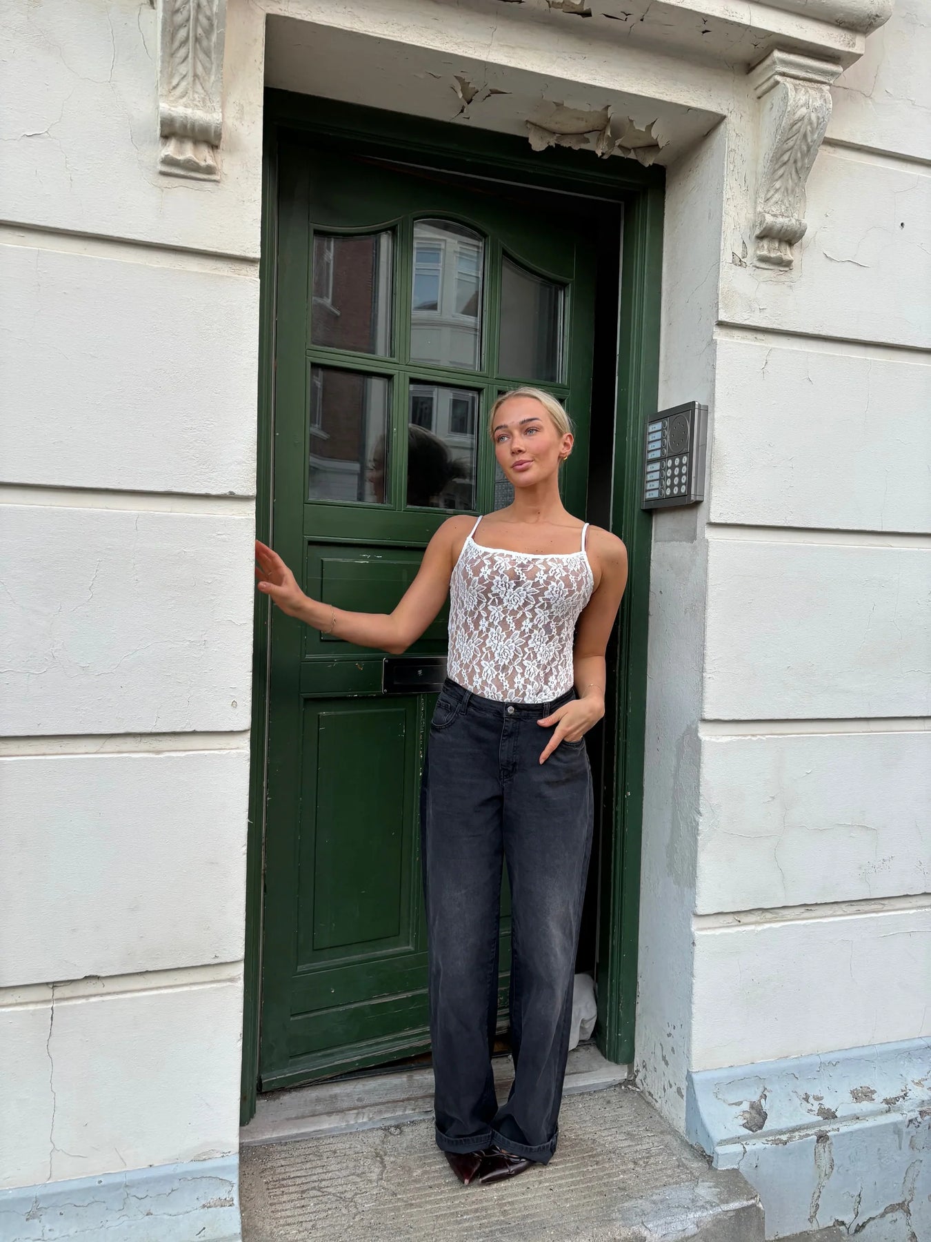 Bodyen er designet i en delikat blondestruktur med tynde stropper og en tætsiddende pasform, der fremhæver figuren på den mest flatterende måde. Den let gennemsigtige kvalitet giver et feminint og sofistikeret udtryk, perfekt til både hverdag og aften