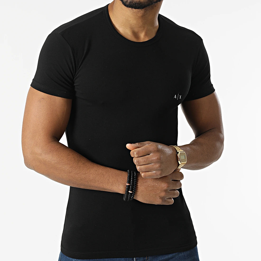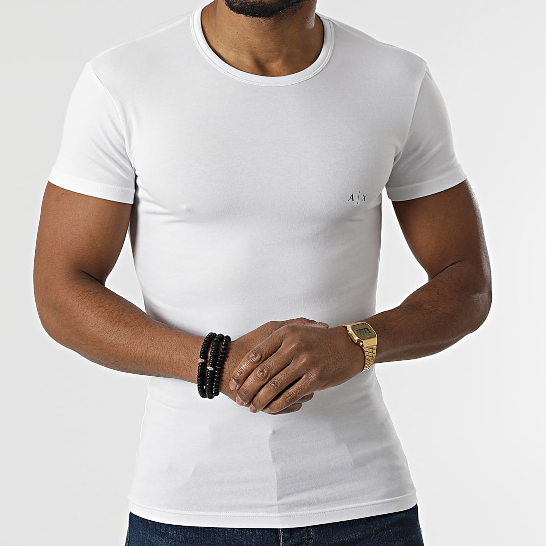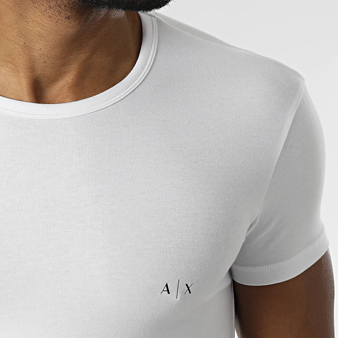Et sæt med to printede T-shirts fra den nye Armani Exchange Collection 2026. Begge modeller har rund hals, et stilrent AX‑print på brystet og et originalt Armani Exchange‑label, der bekræfter ægtheden.